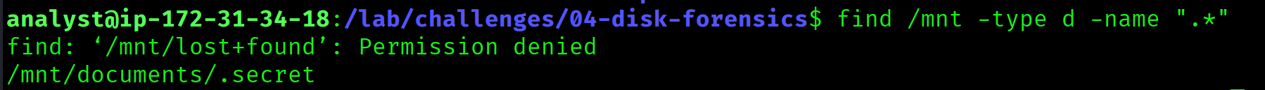The image was mounted to /mnt and a recursive listing with all flags was run. A hidden directory .secret was discovered inside /mnt/documents/, invisible without the -a flag. Inside it was stolen-data.csv.
