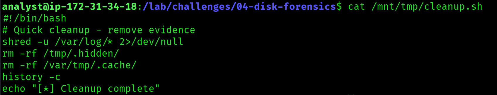 The recursive listing from Flag 4.1 also revealed a script at /mnt/tmp/cleanup.sh. Reading it exposed the attacker's anti-forensics technique: a shred command targeting /var/log/* to destroy all log files and eliminate evidence of the intrusion.