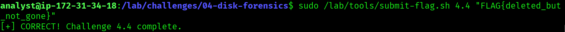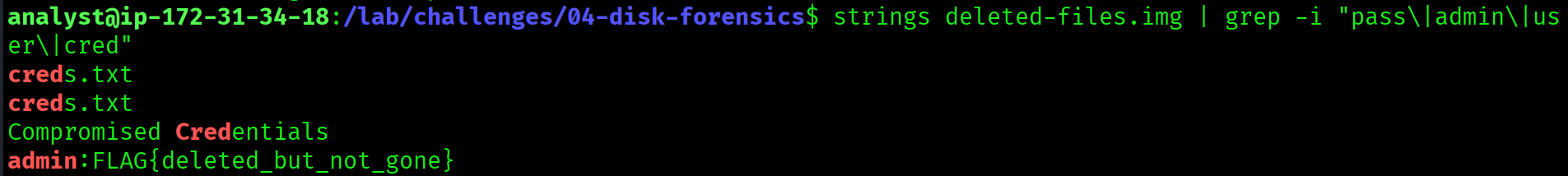 Filtering the output for credential-related keywords recovered the contents of a deleted creds.txt file, showing admin:FLAG{deleted_but_not_gone}.
