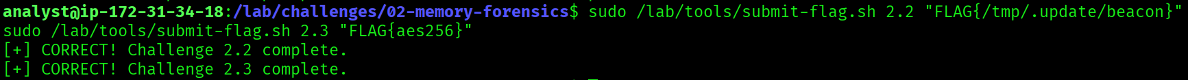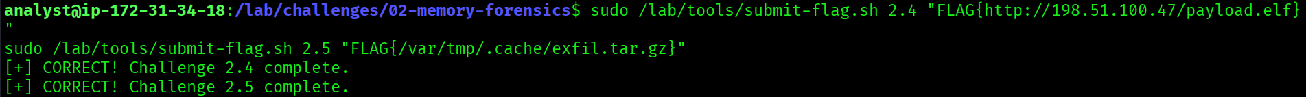 - The same IPs, PIDs, and paths appear across both challenges. Memory and logs tell the same story from different angles.