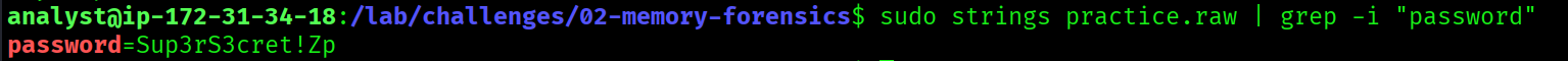 The strings command extracts all readable ASCII text from the raw memory dump. Filtering for "password" revealed Sup3rS3cret!Zp. Cross-referencing against the bash history confirmed the actual password set by the attacker: