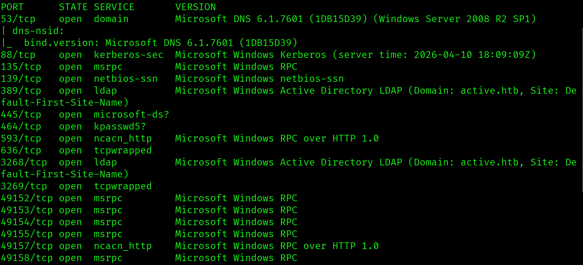 Ports 53, 88, and 389 confirm a Domain Controller. No port 5985, so WinRM is unavailable. No port 80, so there is no web application to enumerate. The domain is active.htb and the OS fingerprint is Windows Server 2008 R2 SP1. On an older DC with no web app and no WinRM, the entire attack surface is SMB.