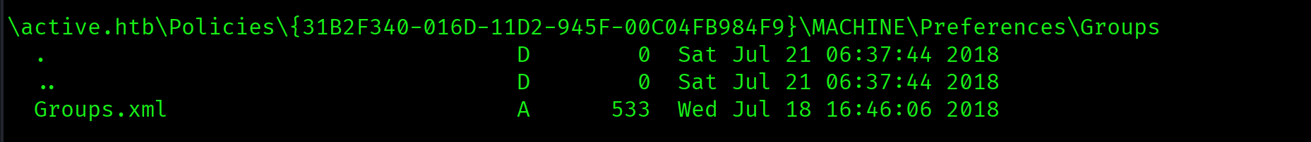 "cd active.htb\Policies\{31B2F340-016D-11D2-945F-00C04FB984F9}\MACHINE\Preferences\Groups; get Groups.xml"