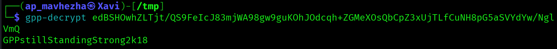 $ gpp-decrypt edBSHOwhZLTjt/QS9FeIcJ83mjWA98gw9guKOhJOdcqh+ZGMeXOsQbCpZ3xUjTLfCuNH8pG5aSVYdYw/NglVmQ