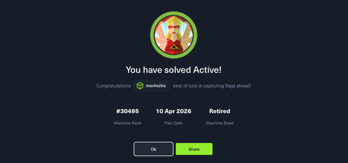 Active is a Windows Domain Controller running Windows Server 2008 R2. The intended path follows two distinct phases: an unauthenticated foothold via a legacy Group Policy Preferences misconfiguration, and privilege escalation via Kerberoasting. There is no web application, no WinRM, and no RPC null session enumeration needed. The entire chain runs over SMB and Kerberos.