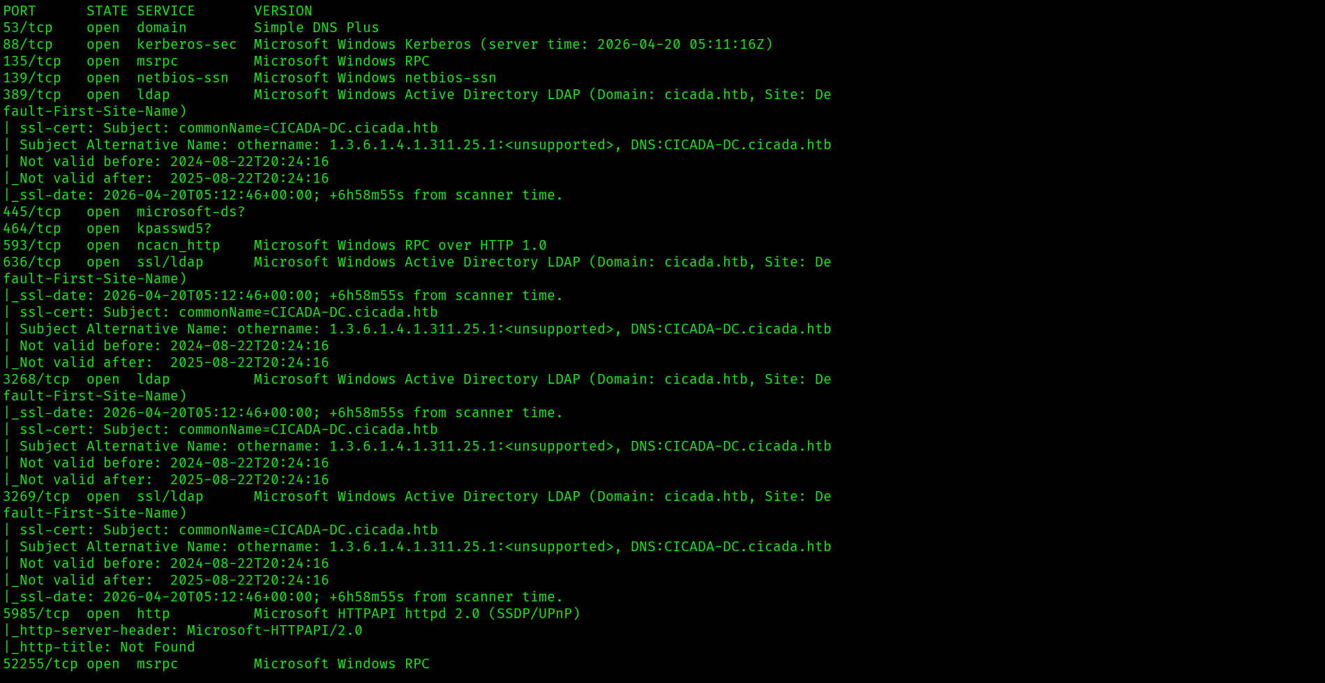 Service scan confirms a domain controller: Kerberos on 88, LDAP on 389, SMB on 445, WinRM on 5985. Domain name is cicada.htb, hostname is CICADA-DC.