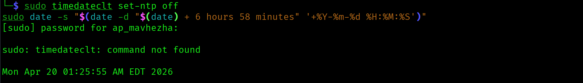 $ sudo date -s "$(date -d "$(date) + 6 hours 58 minutes" '+%Y-%m-%d %H:%M:%S')"