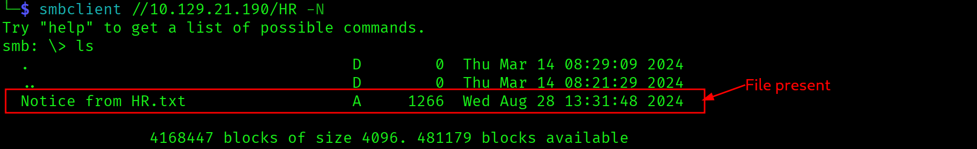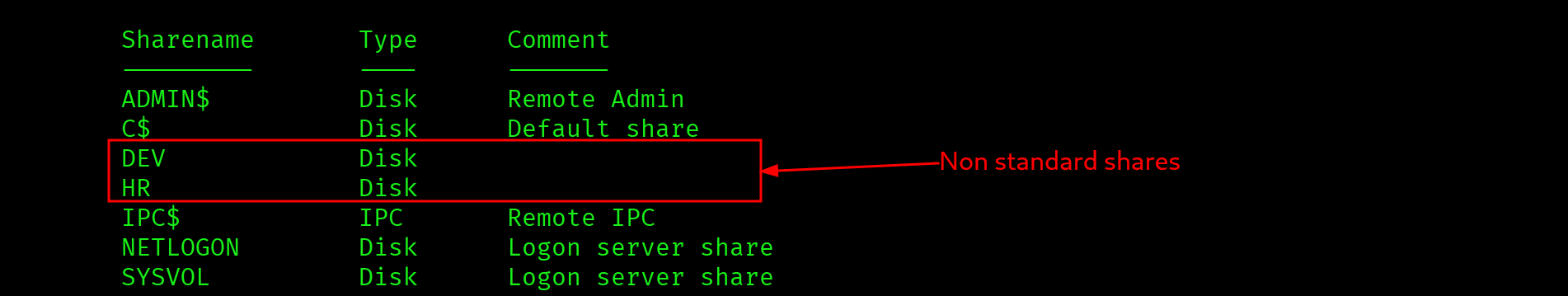| 3 | smbclient anonymous share listing | DEV (denied) and HR (open) non-standard shares found |