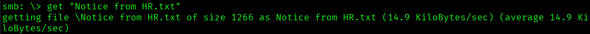 | 4 | HR share enumeration | "Notice from HR.txt" downloaded. Default password: Cicada$M6Corpb*@Lp#nZp!8 |
