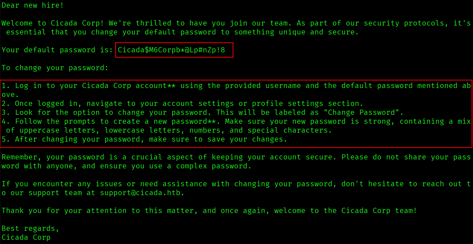 Company default password for new employees: Cicada$M6Corpb*@Lp#nZp!8. Stored in a plaintext file on an SMB share open to anonymous access. No credentials needed to read it.