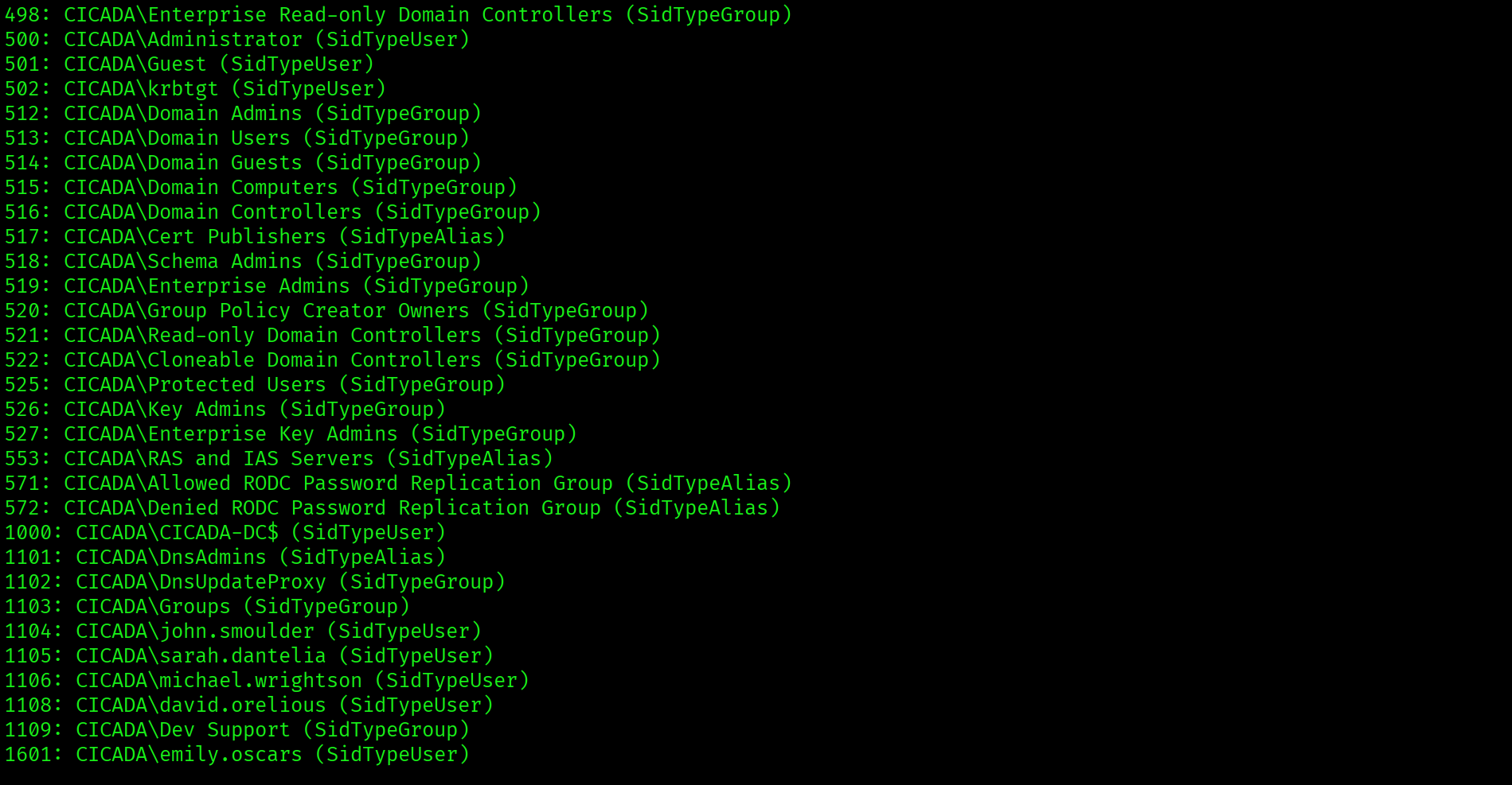 Full domain user list obtained without any credentials. impacket-lookupsid uses the guest account over RPC to enumerate every account by cycling through Security Identifier values. When anonymous SMB is available and null sessions are restricted, the guest SID path frequently still works. Users: Administrator, Guest, krbtgt, CICADA-DC$, john.smoulder, sarah.dantelia, michael.wrightson, david.orelious, emily.oscars.