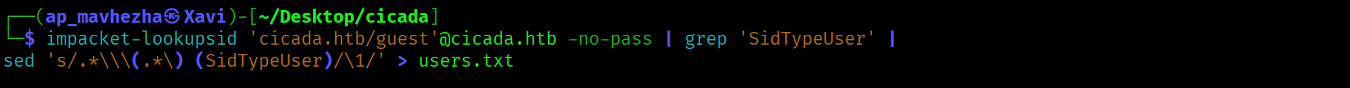 $ impacket-lookupsid 'cicada.htb/guest'@cicada.htb -no-pass | grep 'SidTypeUser' | sed 's/.*\\\(.*\) (SidTypeUser)/\1/' > users.txt