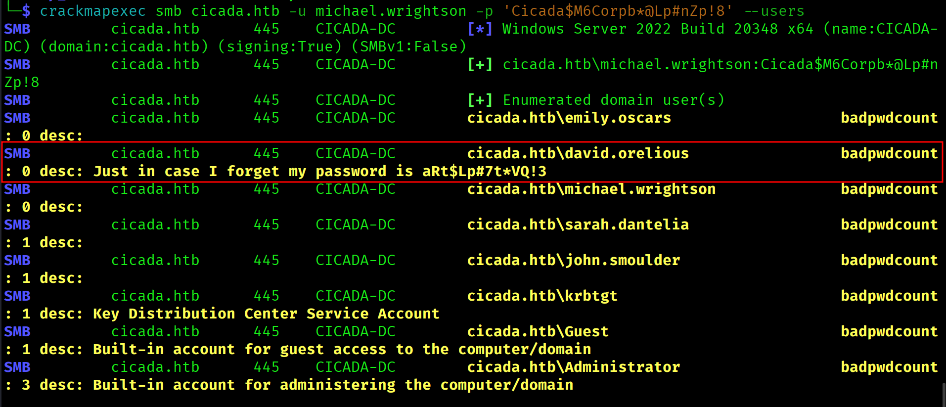 $ crackmapexec smb cicada.htb -u michael.wrightson -p 'Cicada$M6Corpb*@Lp#nZp!8' --users