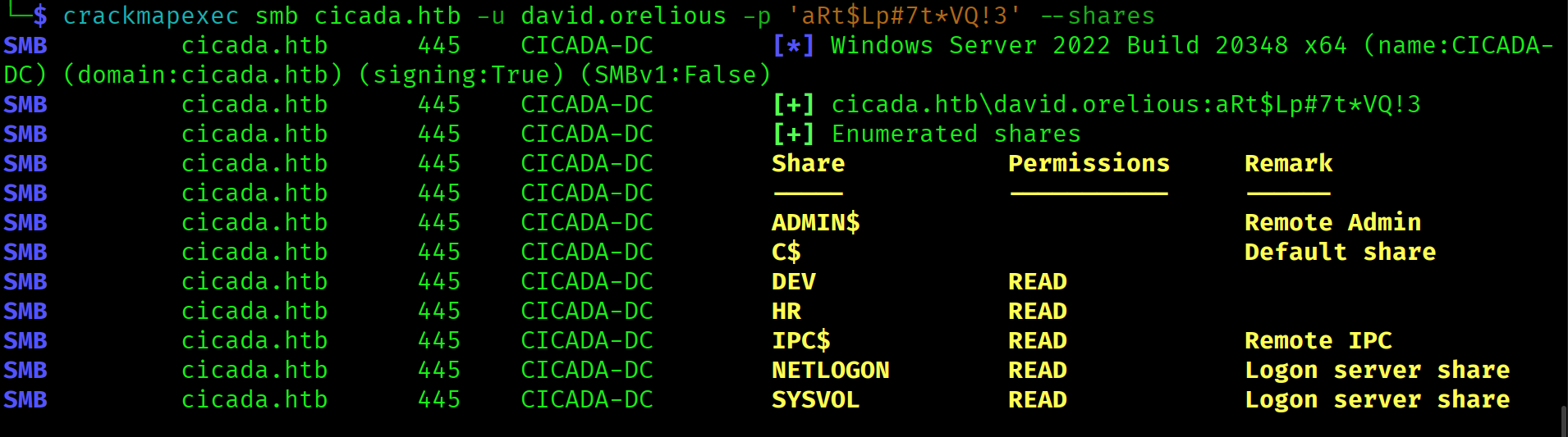 $ crackmapexec smb cicada.htb -u david.orelious -p 'aRt$Lp#7t*VQ!3' --shares
