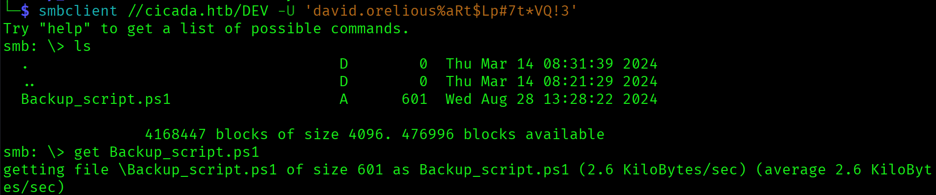 $ smbclient //cicada.htb/DEV -U 'david.orelious%aRt$Lp#7t*VQ!3'