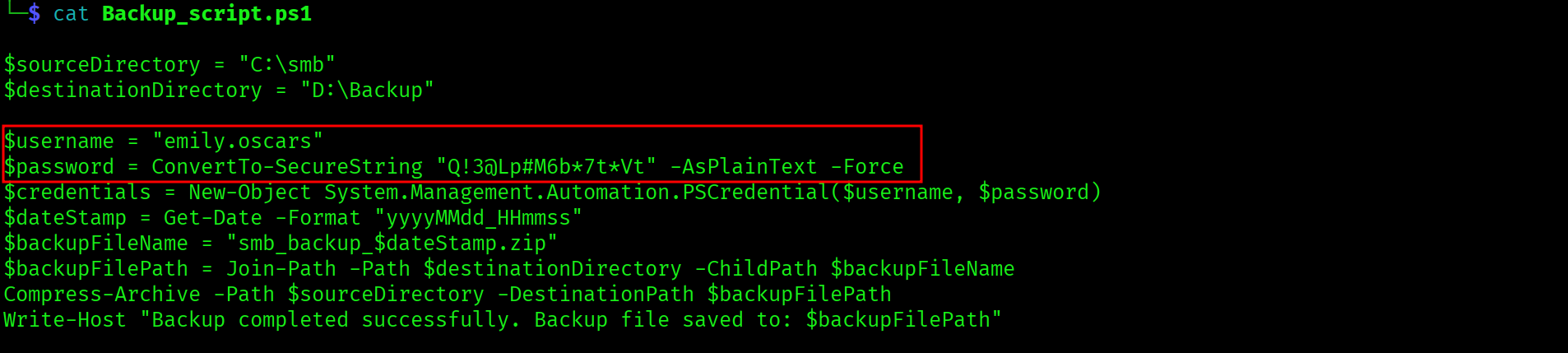 Backup_script.ps1 contains credentials for emily.oscars in plaintext: Q!3@Lp#M6b*7t*Vt. The password is passed to ConvertTo-SecureString with the -AsPlainText -Force flags, which means it exists as a readable string in the script file. Any script or batch file on an accessible share is a credential hunting target.