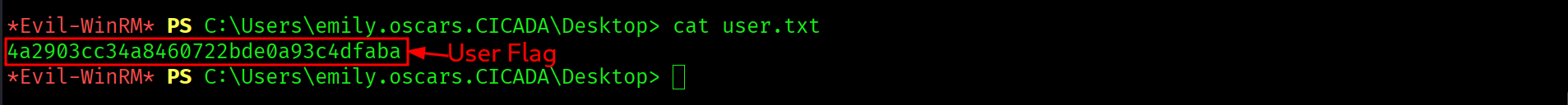 *Evil-WinRM* PS> type C:\Users\emily.oscars.CICADA\Desktop\user.txt