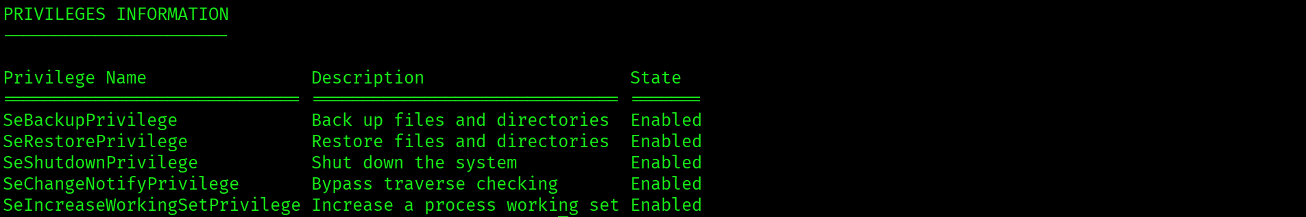 | 11 | whoami /priv | SeBackupPrivilege enabled |