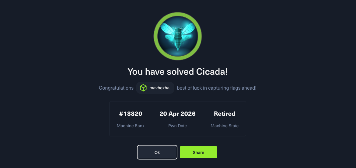 Cicada is a Windows Active Directory machine built around a realistic credential exposure chain. There is no CVE to exploit, no unpatched service to overflow. The entire path from unauthenticated visitor to domain Administrator runs on misconfigurations and bad security habits that appear in real environments every week.