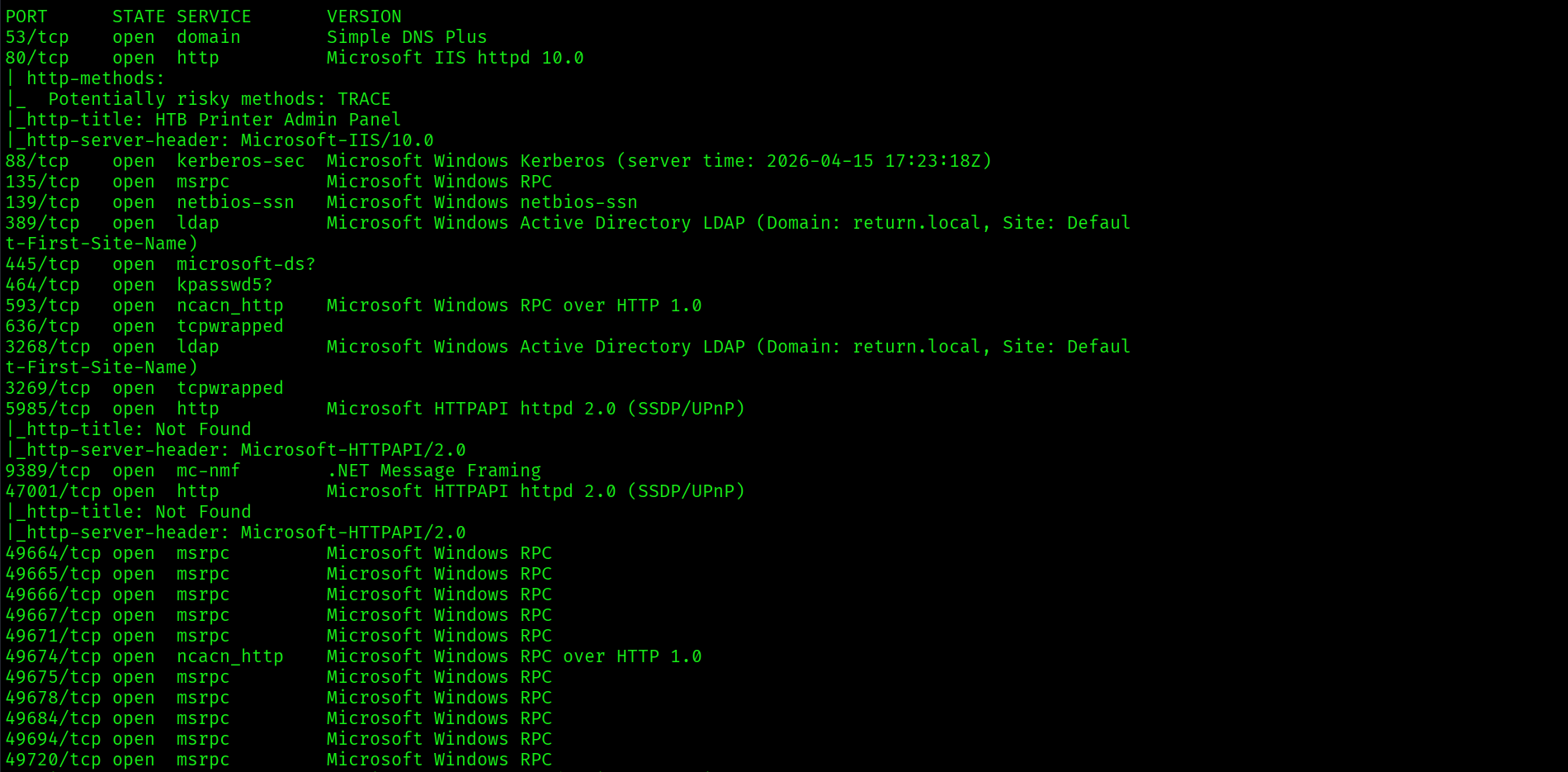 | 1 | Nmap two-phase scan | Port 80 HTTP printer panel, port 5985 WinRM, 18-min clock skew noted |