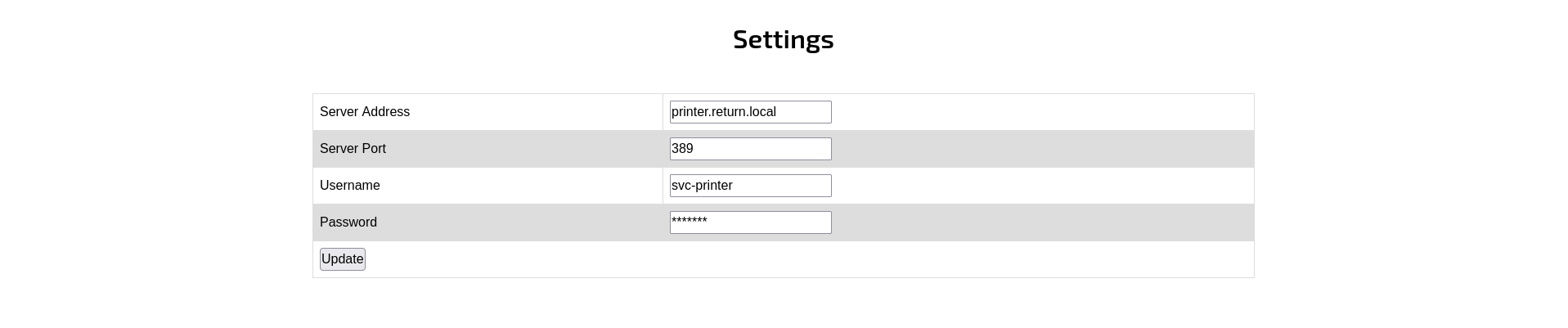 The printer sends credentials to authenticate against whatever server address is configured when Update is clicked. Start a netcat listener on port 389, then replace printer.return.local with Kali IP 10.10.15.67 and click Update: