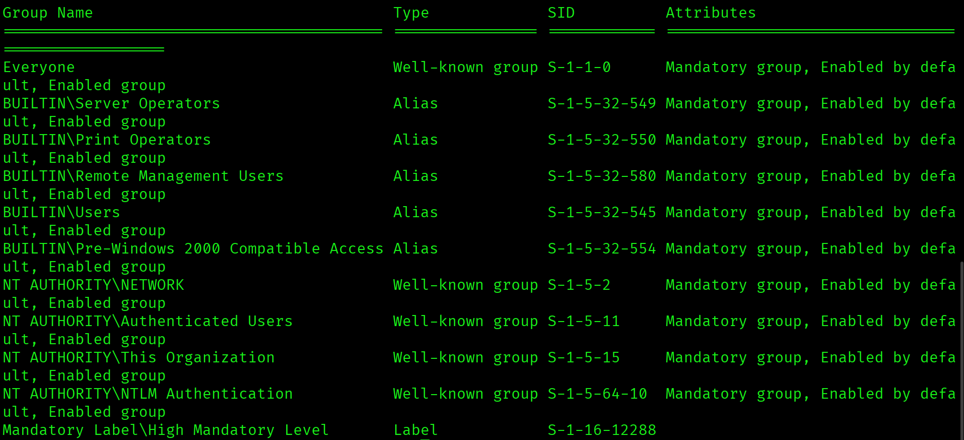 BUILTIN\Server Operators Mandatory group, Enabled by default, Enabled group